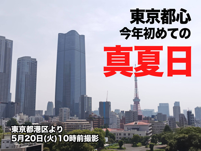 東京都心は8時台には25℃を突破し、先ほど11時19分に30℃に到達しています。最高気温の平年値では、30℃というと7月中旬並みです。直近5年間の初真夏日の観測日を見ると5月下旬〜6月上旬に観測する年が多く、今年は一昨年2023年に次いで早い観測となりました。