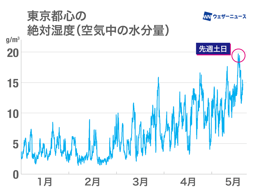 東京都心も11時19分に今年初めて30℃に到達し、真夏日になっています。その後31.1℃まで上がり、7月下旬並みの暑さとなりました。東風が吹き付けた昨日19日(月)の同時刻に比べると、10℃以上高い状況です。