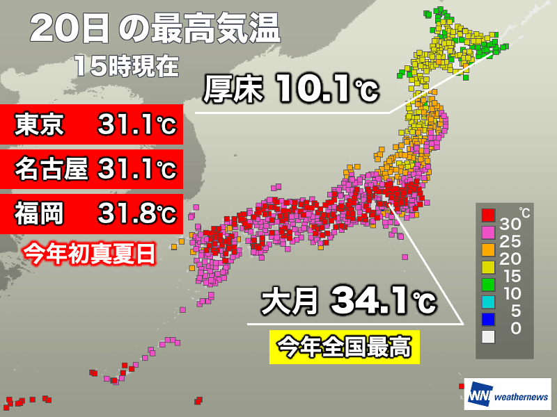 全国で最も気温が高くなったのは山梨県大月市で、14時56分に34.1℃を観測しています。今年の全国最高気温も更新しました。名古屋市や福岡市も今年初めて真夏日になるなど、全国の真夏日地点は208地点にのぼり、今年一番の暑さになった所が多くなりました。