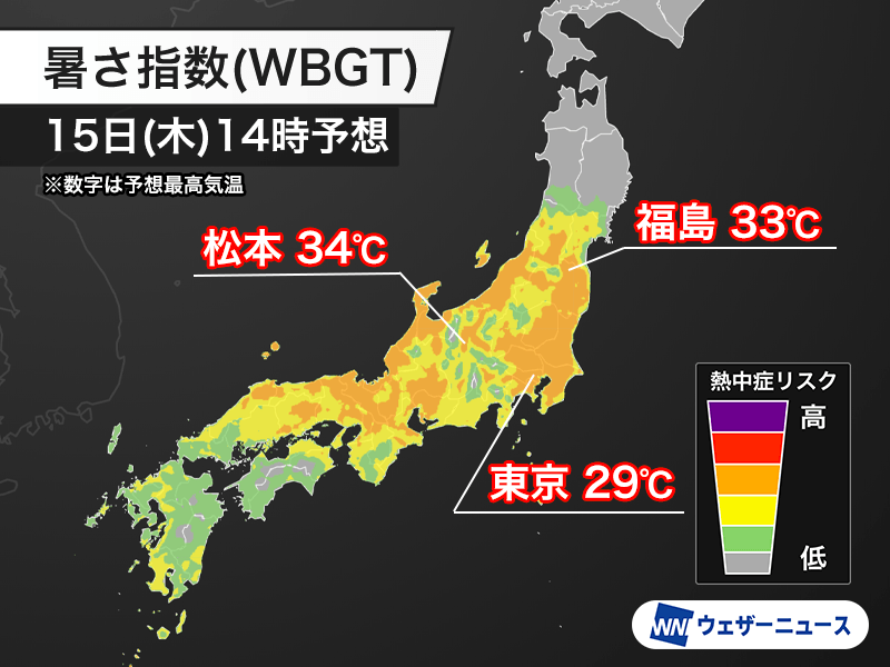 午後の最高気温は長野県松本市で34℃、福島県福島市で33℃の予想で、厳しい暑さになる見込みです。東京都心は29℃と昨日よりは少し低い予想となっていますが、湿度が高い分だけ蒸し暑くなります。