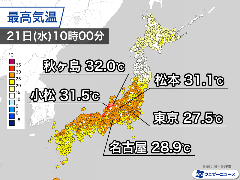 山越えの南寄りの風でフェーン現象となっている北陸で特に気温が高く、石川県小松市は8時半過ぎに30℃に到達。10時00分の時点では31.5℃まで上昇しています。そのほか、全国で最も高い富山県秋ヶ島(富山空港)は32.0℃、長野県松本市は31.1℃など真夏日の所が増えてきました。