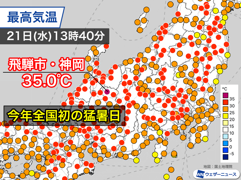 東日本の上空1500m付近には+18℃以上の真夏に近い暖かな空気が流れ込み、晴れている地域を中心に気温が上昇しています。岐阜県飛騨市・神岡では13時30分すぎに35.0℃を観測して、全国で今年初めての猛暑日となりました。