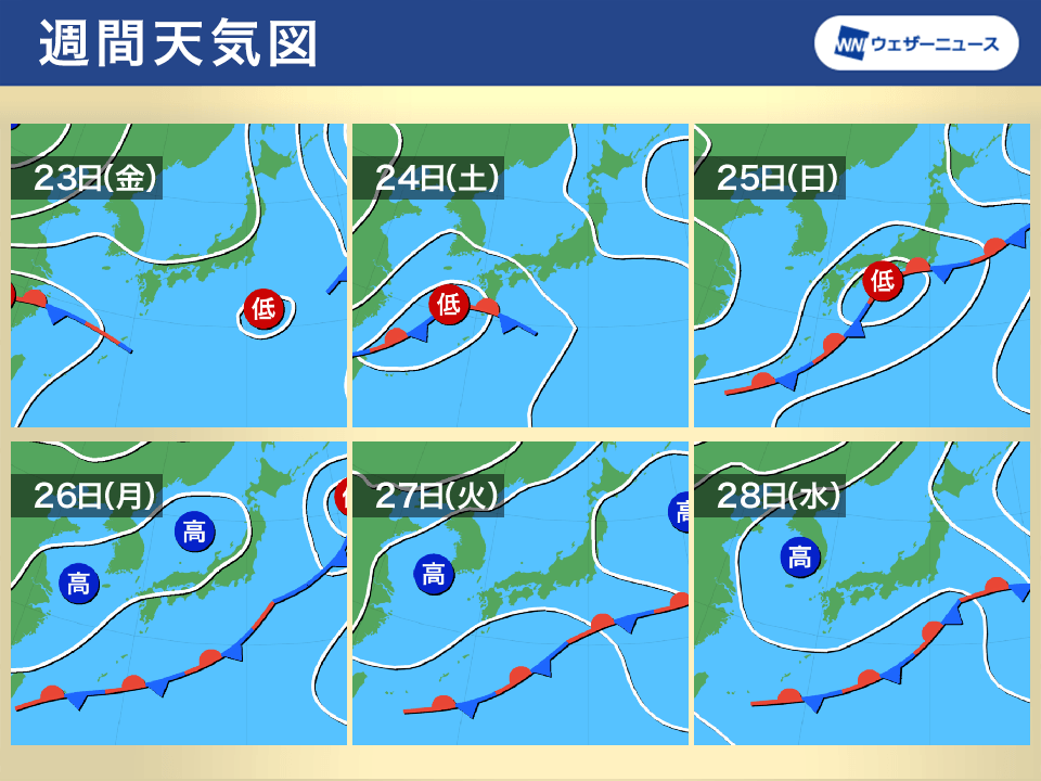 ただ、24日(土)になると再び前線が北上します。前線上に低気圧が発生して東へ進む見込みで、太平洋側を中心に雨の強まるおそれがあります。今月は土日に雨の降ることが多くなっていますが、今度の週末も西から雨となりそうです。