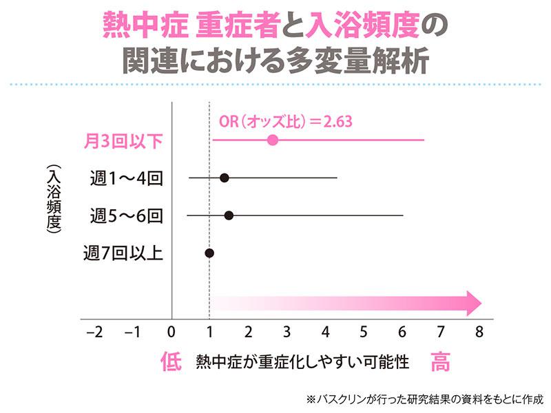 一方で、入浴頻度と夏バテの重症度の関連における多変量解析では、週7回以上の入浴は月3回以下の入浴と比較して、夏バテの重症化リスクが低下する可能性が示唆されています(※b)。