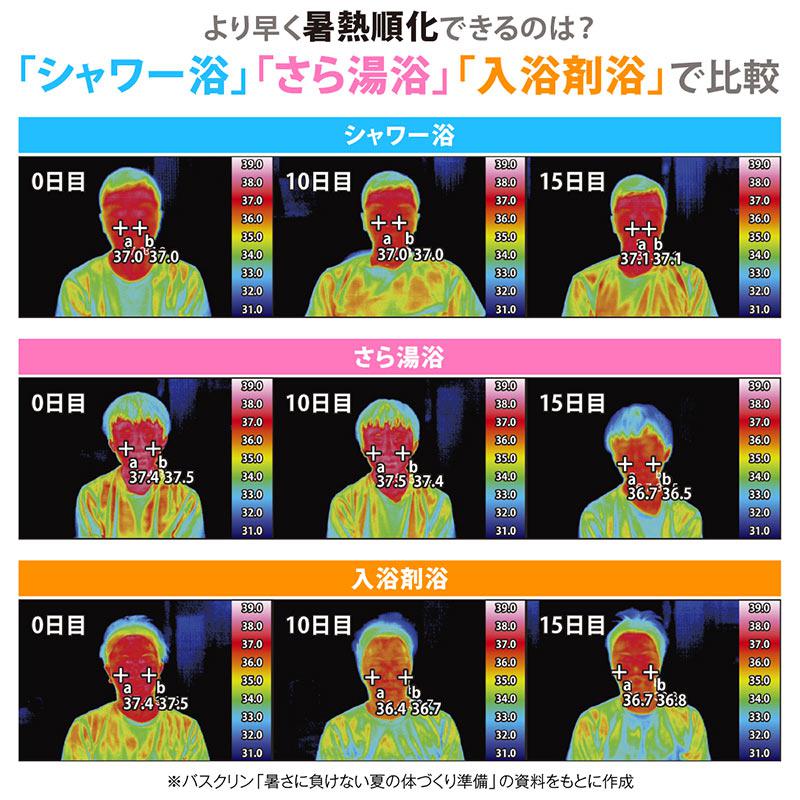 調査方法:バスクリンつくば研究所での入浴テスト(14日間の「シャワー」「さら湯」「無機塩含有炭酸ガス入浴剤」連続浴)、暑熱負荷テスト(30℃50% 環境下にマスク着用で30分間曝露後、マスクを外した直後の皮膚表面温度を測定)