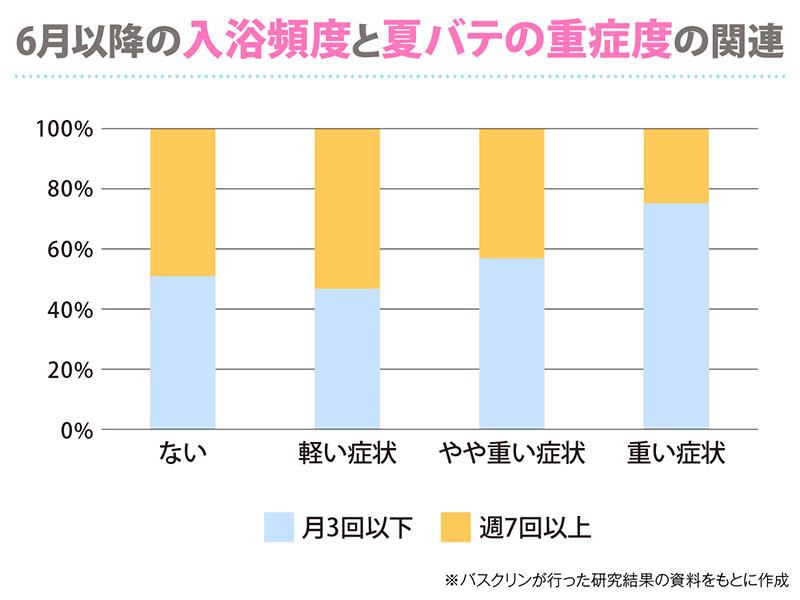 「6月以降の入浴頻度と夏バテの重症度を調査したところ、入浴の実施頻度が月3回以下の方は、週7回以上の方よりも、『夏バテの重い症状があった』と回答された割合が有意に多いことが示されていました(※a)。