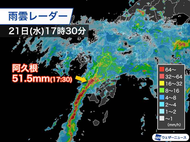 雲の高さは10,000mを超えるほどに発達していて、通過するタイミングでは10分間に10mm以上(1時間換算では60mm以上の非常に激しい雨)を降らせています。鹿児島県阿久根市では17時30分までの1時間に51.5mmを観測しました。
