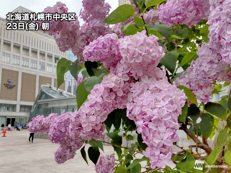 北海道の上空には昨日22日(木)から今朝にかけて、この時期としては強い寒気が流れ込み、大気の状態が不安定になって所々で雨や霰(あられ)が降りました。北寄りの風で気温も上がらず、「リラ冷え」となった所が多くなっています。