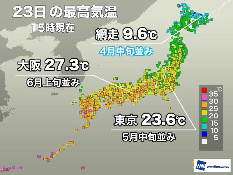 予想最高気温は福岡で22℃、高知で23℃、大阪や広島で21℃など、西日本でも25℃に届く所はほとんどありません。関東や東北太平洋側は20℃を下回る予想です。