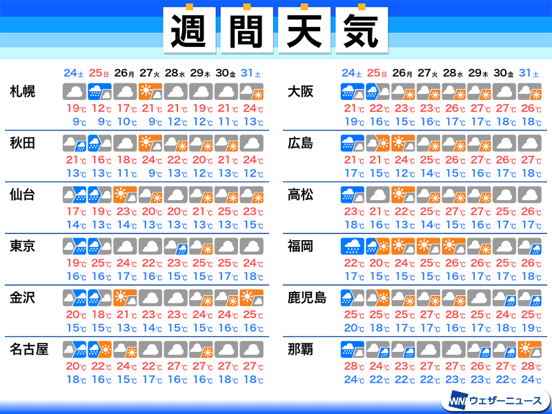 また、低気圧通過後は上空の寒気が南下します。明後日は福岡で20℃、札幌で12℃など、西日本や北日本を中心に平年より気温がかなり低くなる所が多い予想です。寒気の影響は26日(月)頃まで続く見通しで、週前半はこの時期としてはひんやり感じることもあるかもしれません。