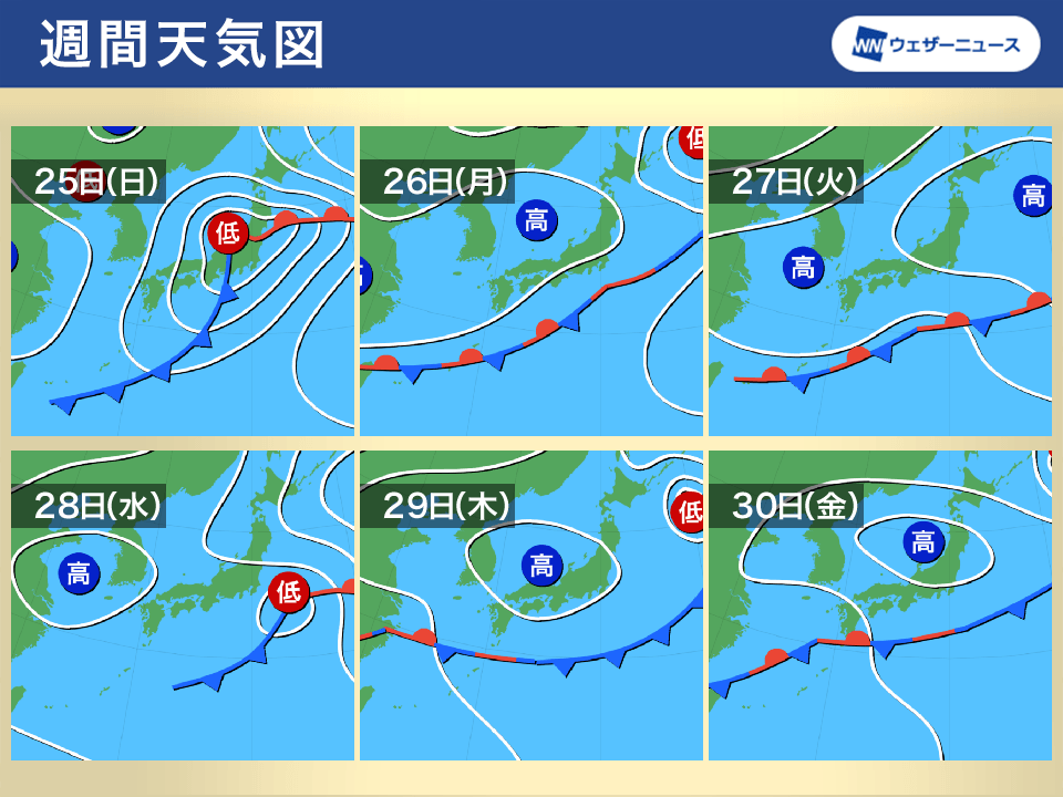 来週後半になると西から暖かな空気が流れ込み、気温が上がって平年並みの所が多くなるとみられます。関東から西日本では25℃以上の夏日になりますが、梅雨前線が南の海上に離れていることと、大陸からくる高気圧が乾いた空気を運んでくるため、湿度は低めで蒸し暑さはそれほどなさそうです。