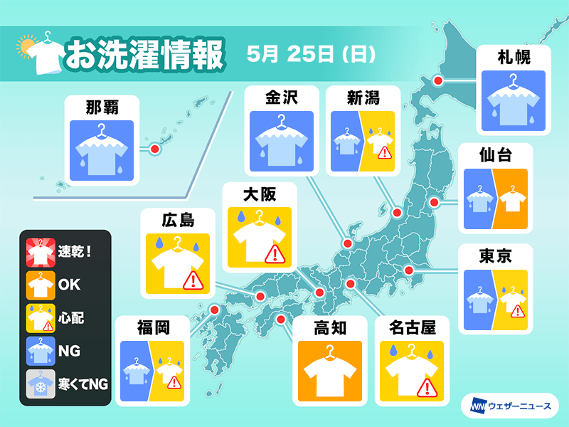 東北太平洋側や関東では段々と雨は止んで、昼間は日差しが届くこともあります。ただ、雲が多く再び雨の降る可能性があるので、部屋干しが安心です。