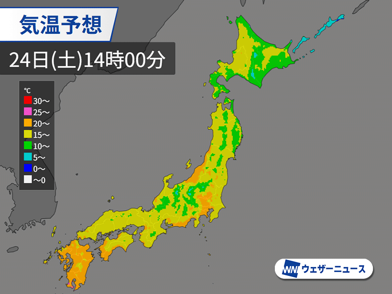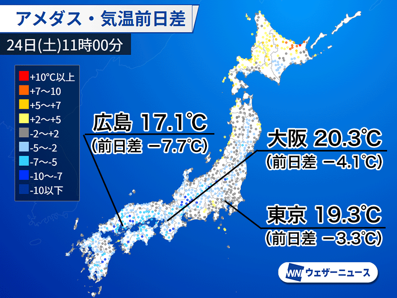 今日24日(土)11時の気温は、福岡で昨日の同じ時刻より3.2℃低い18.8℃、広島は7.7℃低い17.1℃、大阪は4.1℃低い20.3℃となっています。