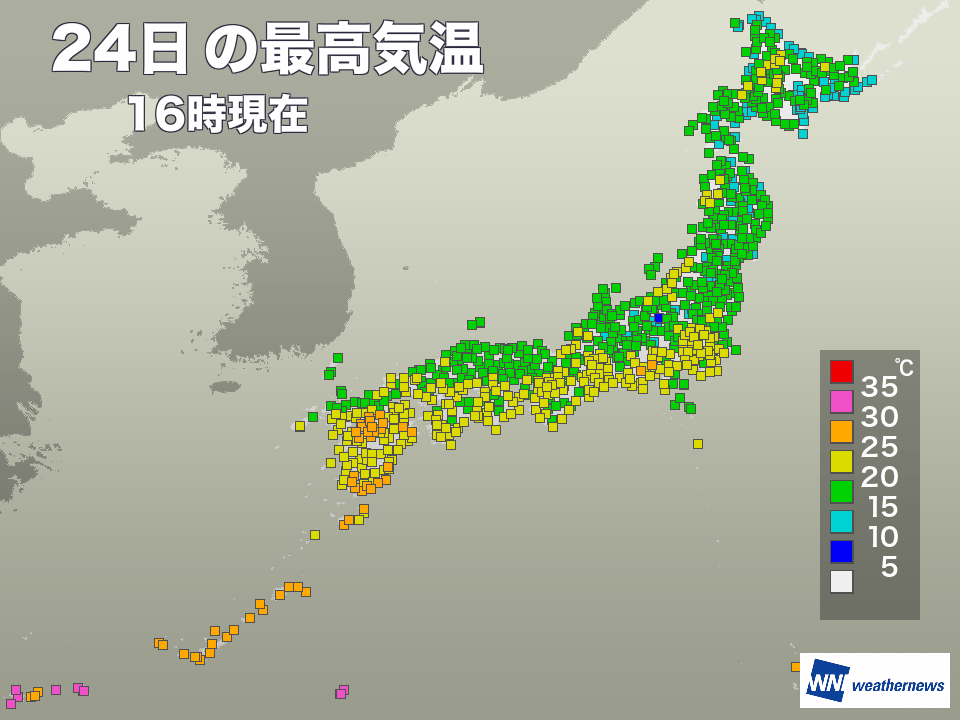 今日24日(土)の西日本は本降りの雨となっているところが多く、昨日より気温は低めで涼しく過ごしやすい体感でした。16時までの最高気温は、福岡では未明に観測された19.6℃、広島も同じく未明の21.8℃、大阪は22.0℃となっています。