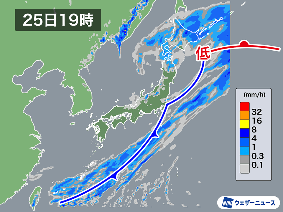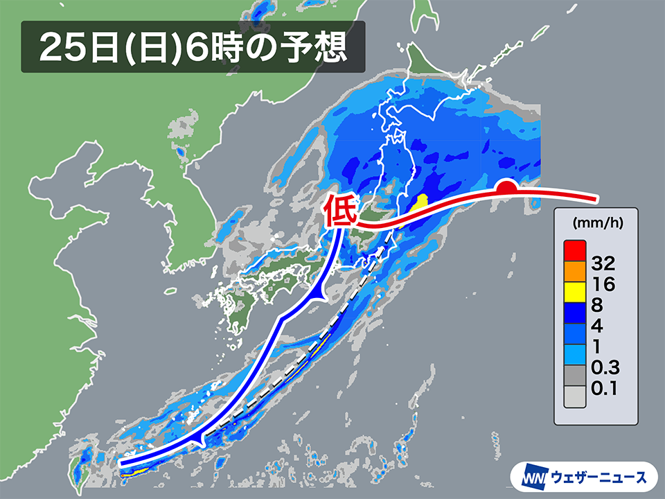 低気圧は明日25日(日)には北陸へ進みます。また、低気圧の東にのびる温暖前線上には新たに低気圧が発生し、三陸沖から北海道の南東へ進む予想です。
