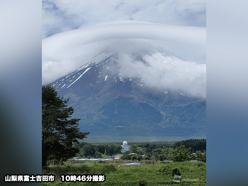 今朝は本州付近を通過した前線の影響で本降りの雨となった山梨県ですが、前線が離れて徐々に天気が回復してきました。そのタイミングで、雲の隙間から雄大な笠雲をまとった富士山が現れました。