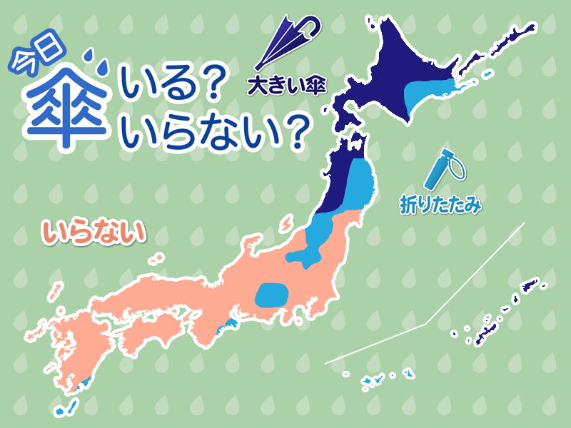 東北北部の太平洋側でも朝のうち弱い雨の降ることがあります。関東甲信や静岡では午後はにわか雨の可能性があります。外出には折りたたみ傘があると安心です。
