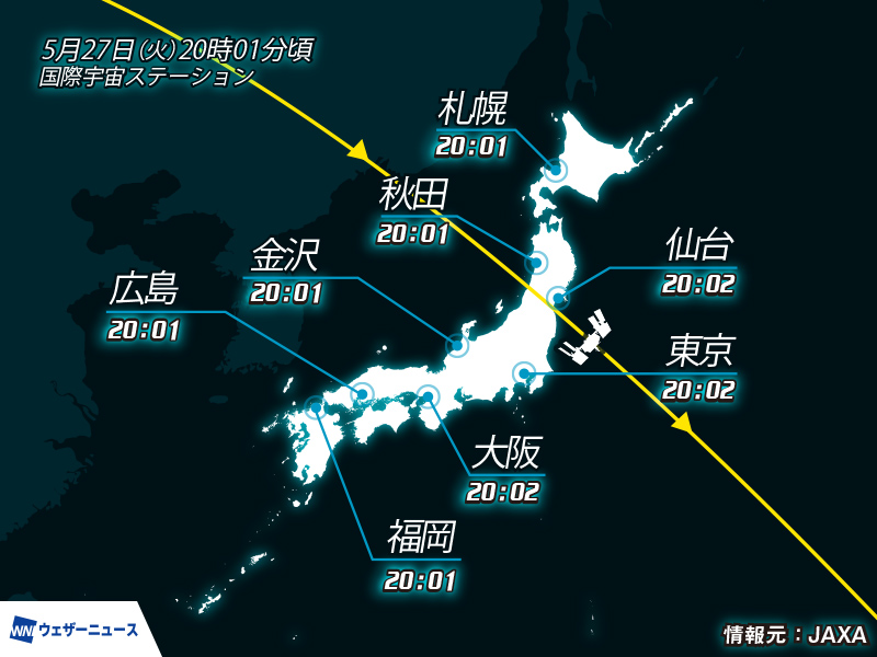 日本の南岸にある前線から遠い北海道や東北北部では上空高いところに薄雲がかかる心配はあるものの、ISSが通過するのを見ることができるところが多くなりそうです。