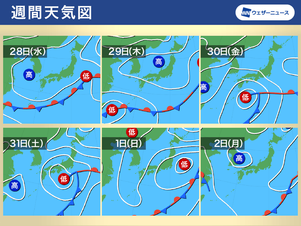 週中頃は前線がやや北上傾向