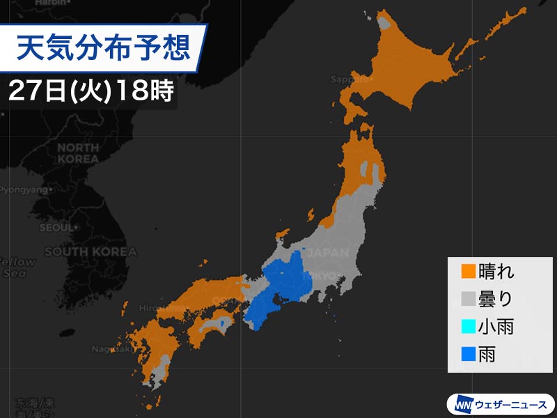 関東甲信や東海、近畿でもにわか雨の可能性があるので、折りたたみ傘を持ってお出かけください。