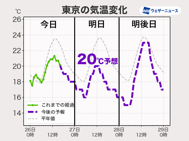 予想最高気温は東京で4月中旬並みの20℃、名古屋では4月下旬並みの21℃となっています。風が吹くと気温よりも寒く感じられるので、上着を忘れずにお出かけください。