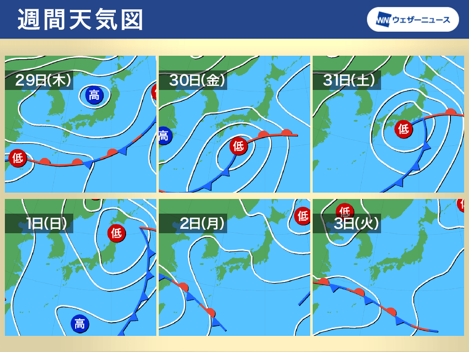 30日(金)はこの低気圧が本州の南に進んでくるため、西日本や東日本の太平洋側で本降りの雨となる予想です。土砂降りの雷雨となる可能性もあるため今後の情報に注意してください。