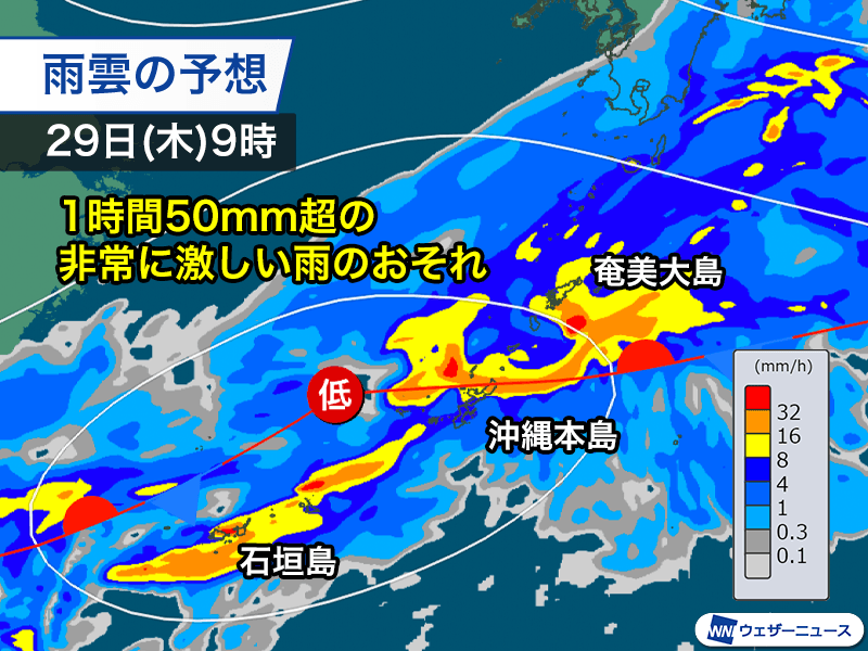 低気圧や前線の周辺では雨雲が発達し、活発な雨雲が島を通過した場合は、1時間に50〜80mmの非常に激しい雨の降るおそれがあります。雨雲が停滞した場合は、それ以上の雨量となる可能性もあり、道路冠水や河川の増水、土砂災害などへの警戒が必要です。