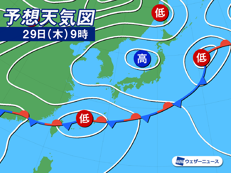 梅雨前線上を通過する低気圧の影響で雨雲が発達し、沖縄や奄美では局地的に雨が強まります。1時間に50〜80mmの非常に激しい雨の降るおそれがあるため、道路冠水や河川の増水、土砂災害などへの警戒が必要です。