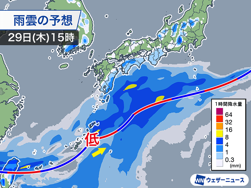 梅雨前線上の低気圧が沖縄の北から東へ進みます。この低気圧や南下する前線の影響で発達した雨雲が通過し、沖縄や奄美では雨が強まるおそれがあります。局地的に1時間に50〜80mmの非常に激しい雨の降るおそれがあるため、道路冠水や河川の増水、土砂災害などに注意・警戒してください。