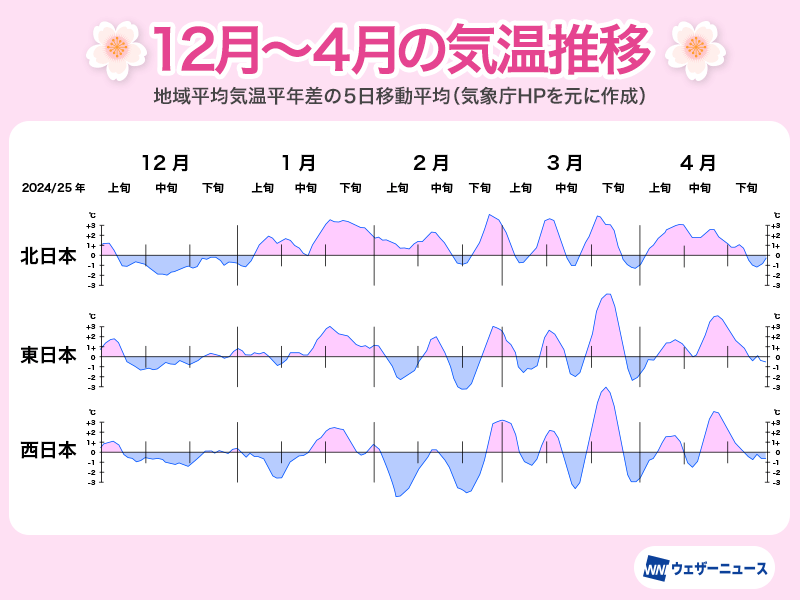 今年の冬から春にかけての気温を見ると、12月は全国的に平年並〜やや低い傾向でした。