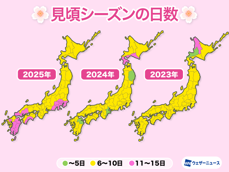 桜の見頃期間について調べると、今年は全国平均で9.7日となり、2024年(7.2日)と2023年(8.1日)よりも長い見頃期間となりました。エリア別に見ると、九州や中国四国、東日本太平洋側では11〜15日となったところがあり、ここ数年と比べても長かったことがわかります。