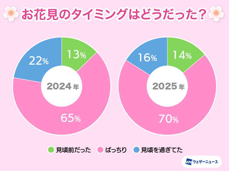 ウェザーニュースアプリのユーザーにお花見のタイミングについて聞いたところ、「ばっちり」という回答が70%で最も多く、昨年よりも「ばっちり」の回答が増加していました。開花から満開になる期間が平年並みで見頃時期が長かったことに加え、西日本や東日本は、高気圧に覆われて晴れた日が多く、開花から満開までの天気がお花見に適した日が多かったため、タイミングよくお花見を楽しめたと考えられます。
