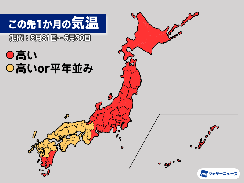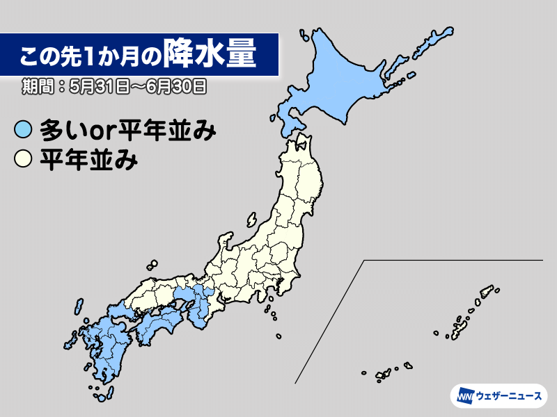 6月の前半は本州付近が高気圧に覆われる日があるものの、半ばからは梅雨前線の影響が強まり、曇りや雨の日が多くなる見込みです。1か月の降水量は西日本の太平洋側と北海道で平年並みか平年より多く、そのほかの各地は平年並みの予想となっています。