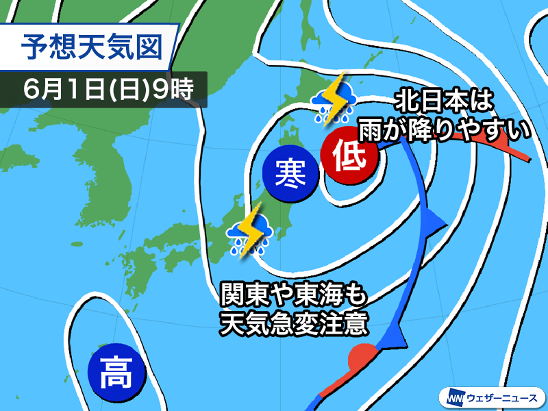 日曜日は低気圧が北上するため、雨のエリアは北日本や北陸が中心になります。低気圧に近い太平洋側では土曜日に続いて雨の強まる所がある見込みです。