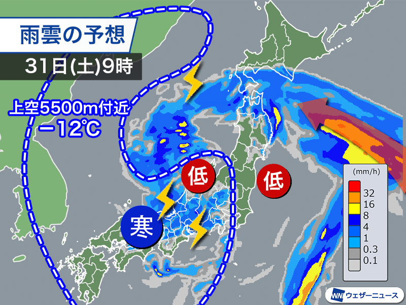土曜日は寒気の中心に近い近畿や東日本で局地的に雨雲が発達しやすく、天気の急変に注意が必要です。活発な雨雲が通過するタイミングでは一時的に雨が強まり、雷や突風、雹(ひょう)などを伴うおそれがあります。