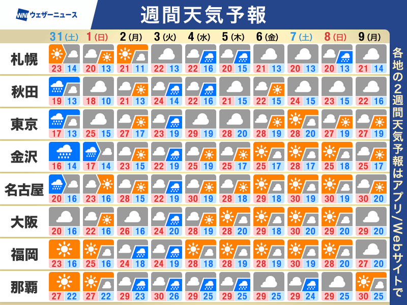 来週後半になると気温は上昇傾向で、最高気温が30℃以上の真夏日になる可能性もあります。梅雨前線が南に離れるため真夏のような蒸し暑さではありませんが、熱中症予防を心がけてください。