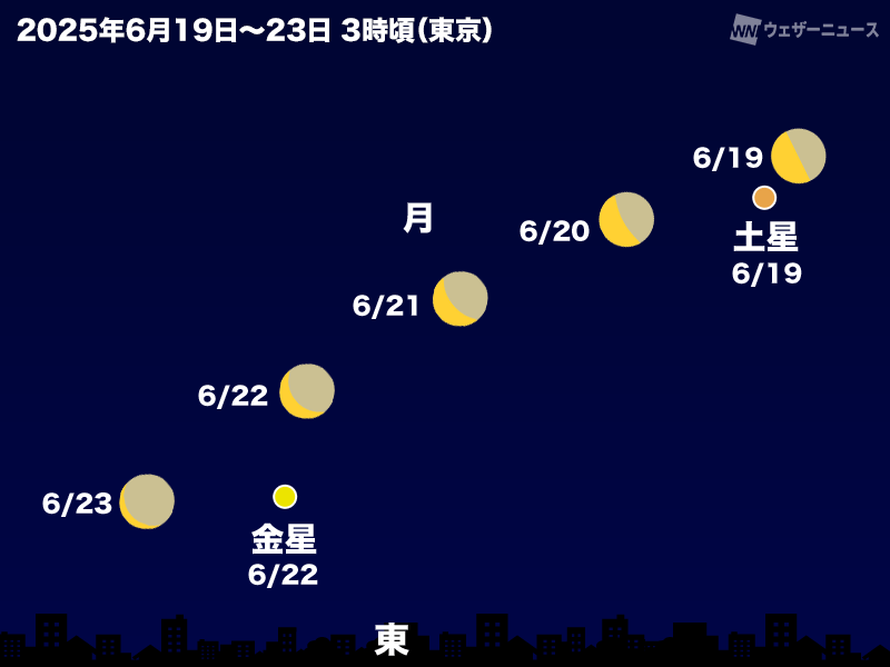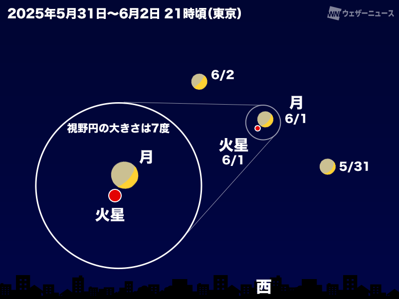 空の低い位置で見えるため、西の方角が開けた場所からお楽しみください。