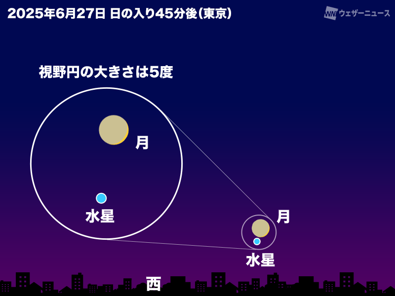 6月27日(金)の夕方には細い月が水星に接近します。日の入り30分後の高度は約10度で、水星の明るさは0.2等です。肉眼でも見ることができますが、双眼鏡を使うと見やすくなります。
