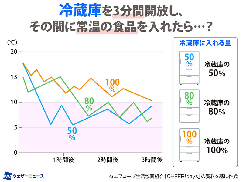 「冷蔵庫に食材を詰める割合を変えて、冷却効果がどのくらい違うのか実験してみたところ、次のような結果が出ました」(光安さん)