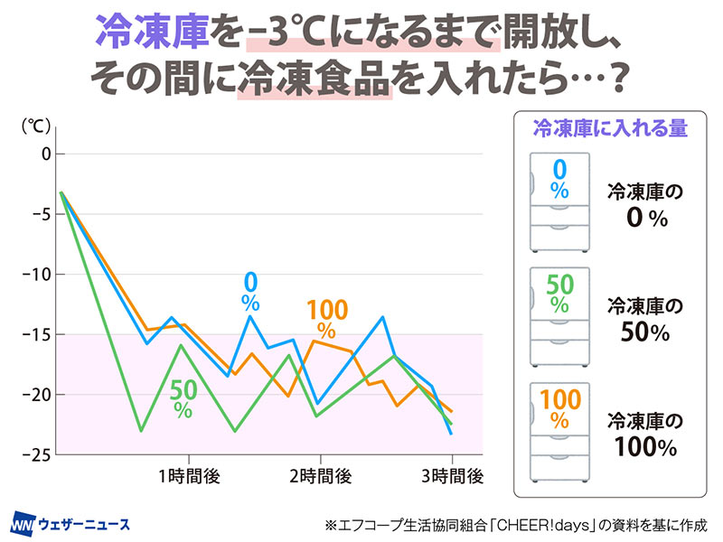 ・家庭用冷蔵庫の冷凍庫の温度が-3℃になるまで開放し、その間に冷凍食品を入れる
