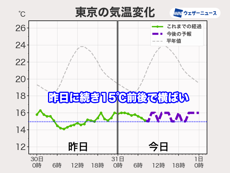 昨日30日(金)の東京都心は深夜の0時半過ぎに最高気温16.5℃を観測した後、昼間は15℃前後でほぼ横ばいとなりました。日付が変わった後も気温の変化は小さく、今朝も15℃くらいで推移しています。