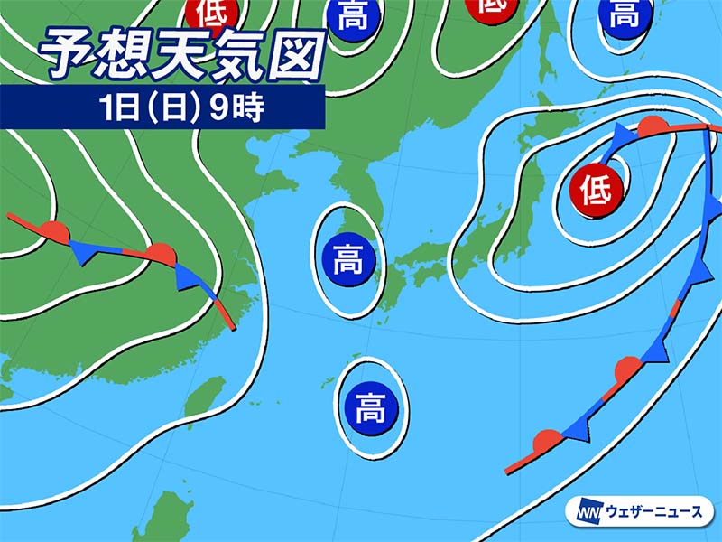 北寄りの冷たい風は収まり、肌寒さは解消します。昼間の気温は昨日31日に比べると5〜8℃ほど高く、比較的過ごしやすくなりそうです。