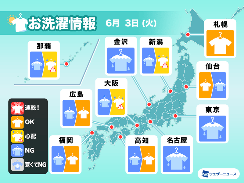 東北南部から沖縄の各地は午前中から雨で、洗濯物の外干しは厳しい空です。ただ、西日本は午後は天気が回復に向かいます。晴れてきたら外干しOKです。
