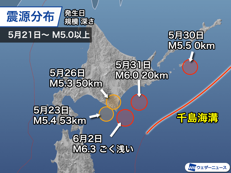 北海道の太平洋側では5月下旬からマグニチュード5〜6クラスのやや大きめの地震が相次いでいる状況です。5月23日に浦河沖でマグニチュード5.4、26日に十勝地方南部でマグニチュード5.3、30日は北海道東方沖でマグニチュード5.5、31日には釧路沖でマグニチュード6.0が発生しました。