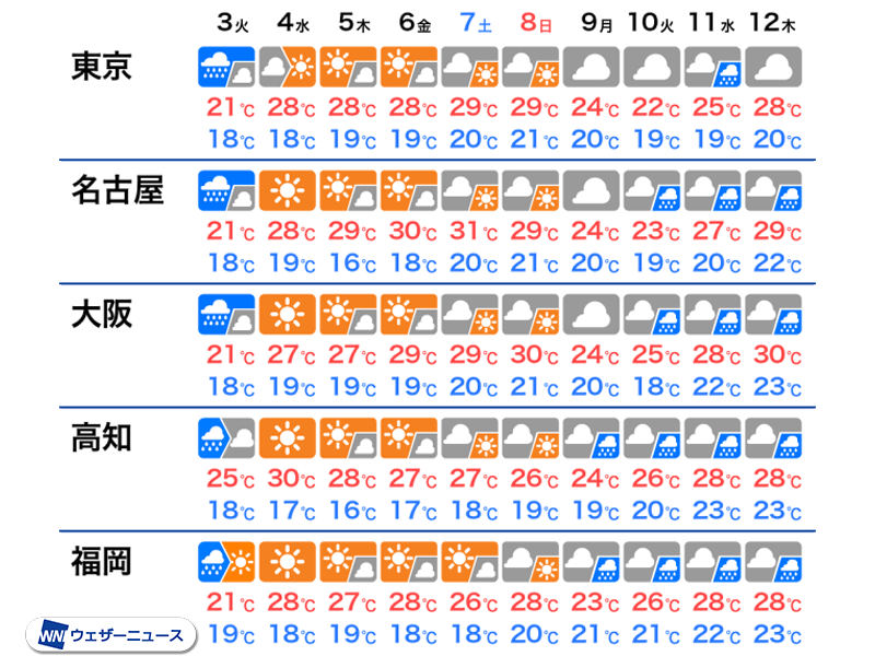 9日(月)は福岡市や高知市で雨が予想され、10日(火)は東海まで雨の範囲が広がる見込みです。東京都心も曇りや雨の日が続く予想で、まさに梅雨らしい天気となります。