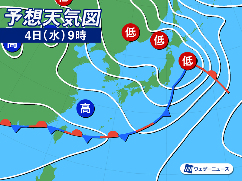低気圧に近い北海道は本降りの雨になります。東北北部は昼頃まで雨の降りやすい空です。