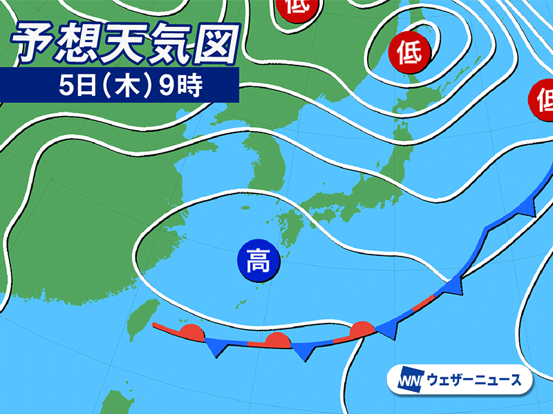 一方、先島諸島や大東諸島では雲が広がり、時々雨が降ります。一時的な強雨や雷雨に注意が必要です。