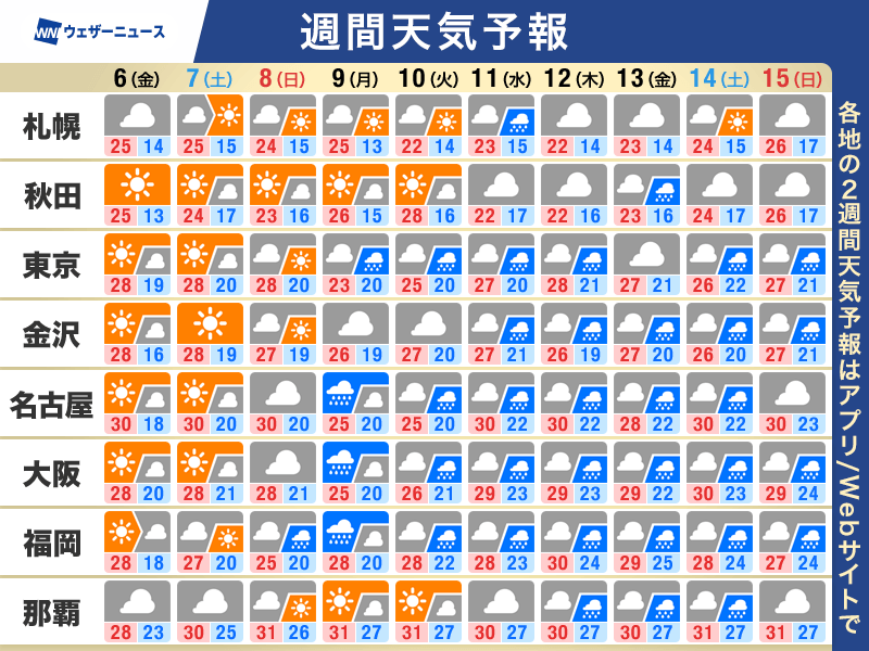 週末にかけては、平年のこの時期よりも晴れる日が多いことで気温は高めになる予想です。関東の各地や名古屋などでも30℃以上の真夏日になるところもありそうです。