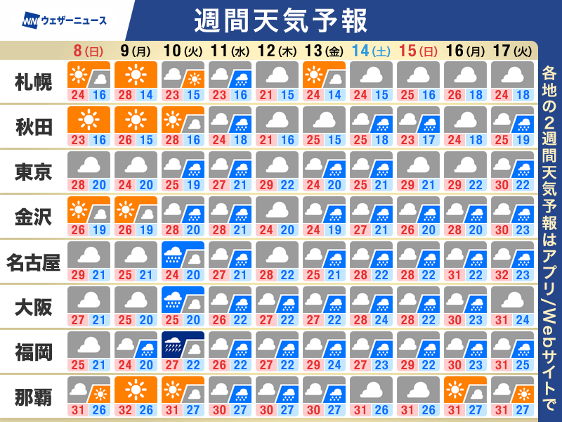 気温の変化はこの時期らしく、雨の降る日は最高気温が低めで、日が差すと高めという予想です。今週までと比べて湿った空気が流れ込みやすくなるため、各地とも蒸し暑さは増しそうです。