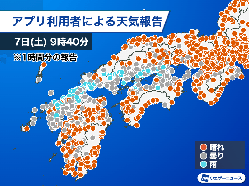 梅雨前線は本州の南の海上にあって陸地から離れているため、東北から九州は広い範囲で晴れています。ただ、西日本には前線帯があり、九州や中国・四国付近には南西から湿った空気も流れ込んできている影響で、雨雲が発生しているとみられます。